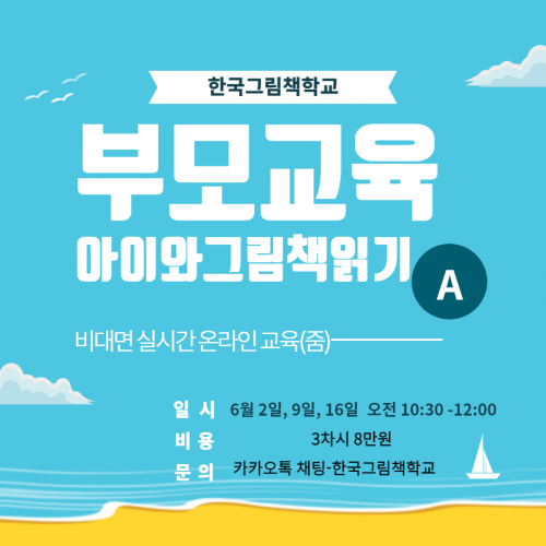 한국그림책학교 부모교육 6월 개강 부모교육 A코스 / 강사 권이은 박사 일시 : 6월 2일, 9일, 16일 오전 10:30-12:00 입금 - 비용 3..